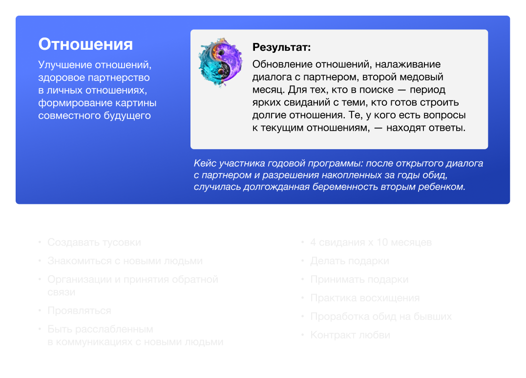 Улучшение отношений, обретение здорового партнерства в личных отношениях, формирование картины совместного будущего