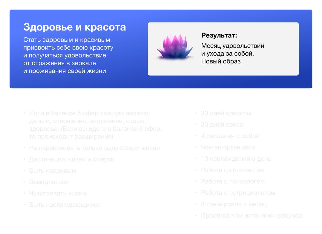 - Идти в балансе 5 сфер каждую неделю: деньги, отношения, окружение, отдых, здоровье. (Если вы идете в балансе 5 сфер, то происходит расширение)