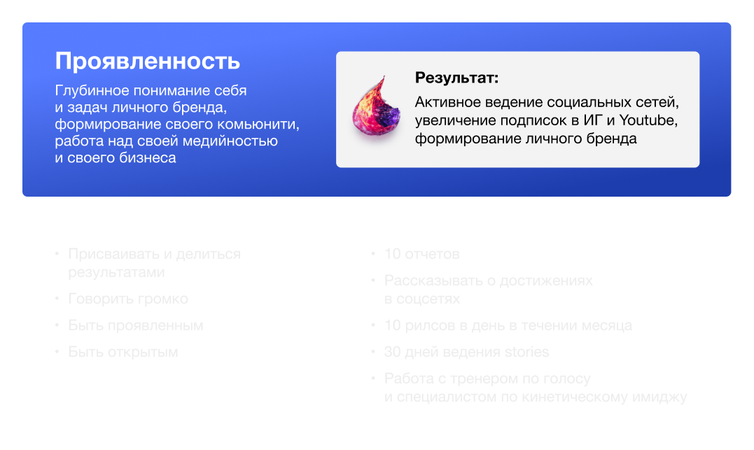 Глубинное понимание себя и задач личного бренда, формирование своего комьюнити, работа над своей медийностью и своего бизнеса