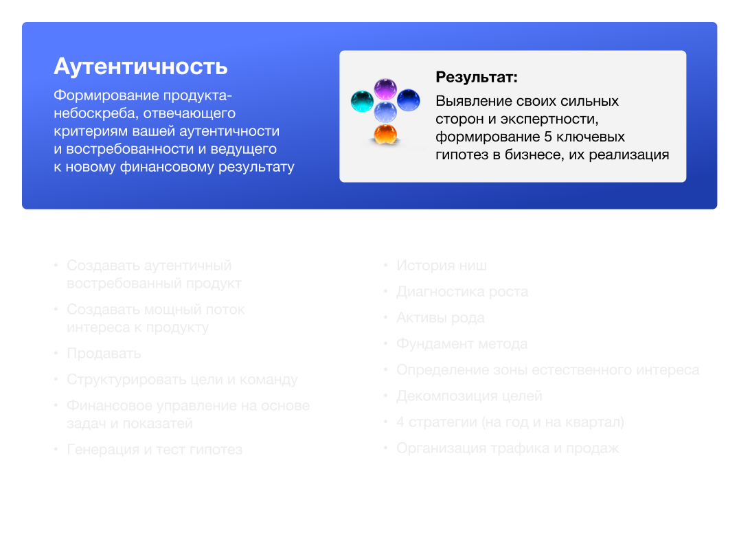 Формирование продукта- небоскреба, который будет отвечать критериям вашей аутентичности и востребованности и приведет к новому финансовому результату